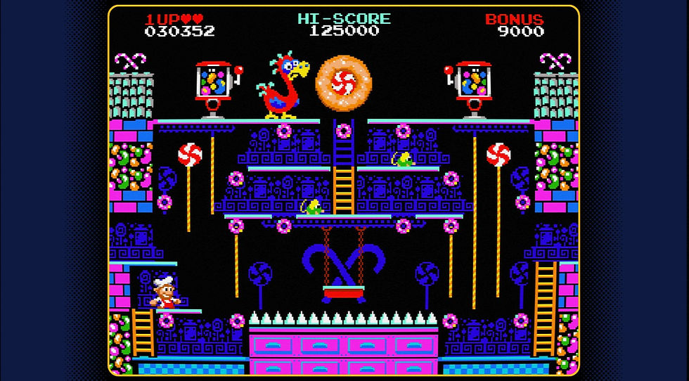 こちらもAnnalynn同様パックマンを始祖に持つドットイート型のゲームだ。画面内のドーナツ(ドット)を全て回収する事でステージクリア。パックマンの様に敵に対する逆転要素は無く、画面構成はどちらかと言うとドンキーコングからの影響が見て取れるが、基本のゲーム性は間違いなくドットイートだ。(ちなみに、ドーナツを光る順番に取っていく事でボーナス点が入るフィーチャーがある)