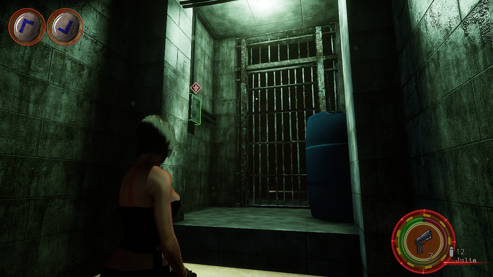 出口は一つなのでそこに向かうと鉄格子が降りて道が塞がれてしまう。同時に転がっていた死体がゾンビとなって襲い掛かってくる。(想定内)